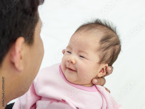 The first true social smiles start brightening moms days between 6 and 8 weeks. Little girl is happy to see her daddy.