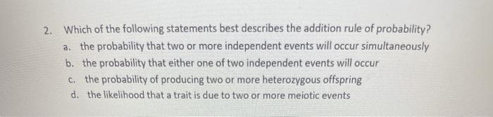 A the probability that two or more independent events will both occur B the probability that two or more independent events will both occur in the offspring of one set of parents C the probability that either one of two independent events will occur. The addition rule is used to calculate the probability of one of the events from multiple pathways. These rules provide us with a way to calculate the probability of the event A or B provided that we know the probability of A and the probability of B. The probability of producing two or more heterozygous offspring D. B the probability that two or more independent events will both occur in the offspring of one set of parents. Which of the following is the best statement of the use of the addition rule probability. The general addition rule of probability is applied to the events which are not mutually exclusive. Calculate the probability of a child having either sickle-cell anemia or cystic fibrosis if parents are each heterozygous for both. The addition rule for probabilities describes two formulas one for the probability for either of two mutually exclusive events happening and the other for the probability of two non-mutually.